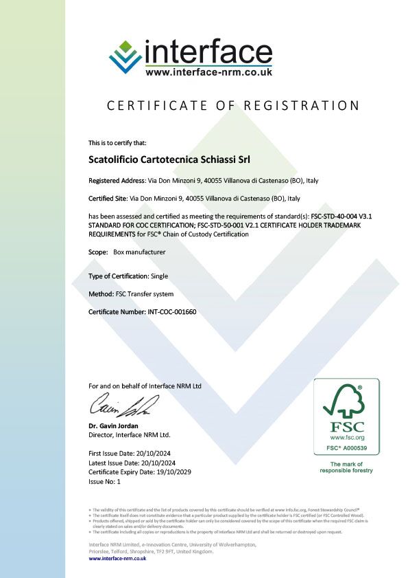 Se per i tuoi imballaggi di oggi e domani cerchi eccellenza e coerenza, Scatolificio Schiassi adotta pratiche di packaging conformi e sostenibili, testimoniate dalla nostra certificazione FSC. Contattaci.